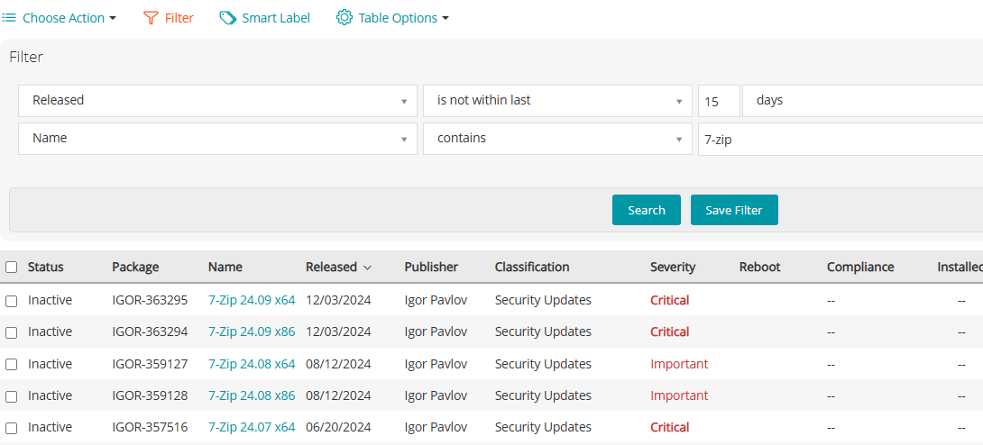 Releasedis not within the last 15 days (to include patches older than 14 days)Namecontains “7-zip”