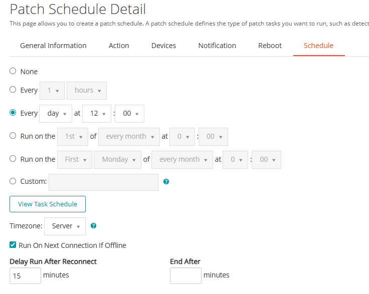 In the Action tab of the Patch Schedule: