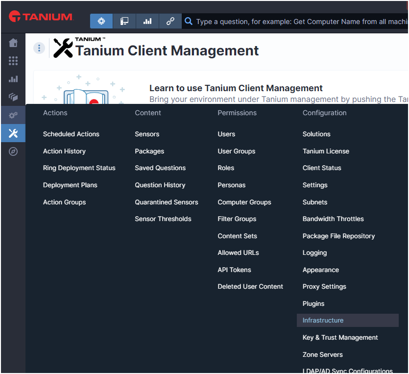 - In the Tanium Console, go to Administration -> Infrastructure.
